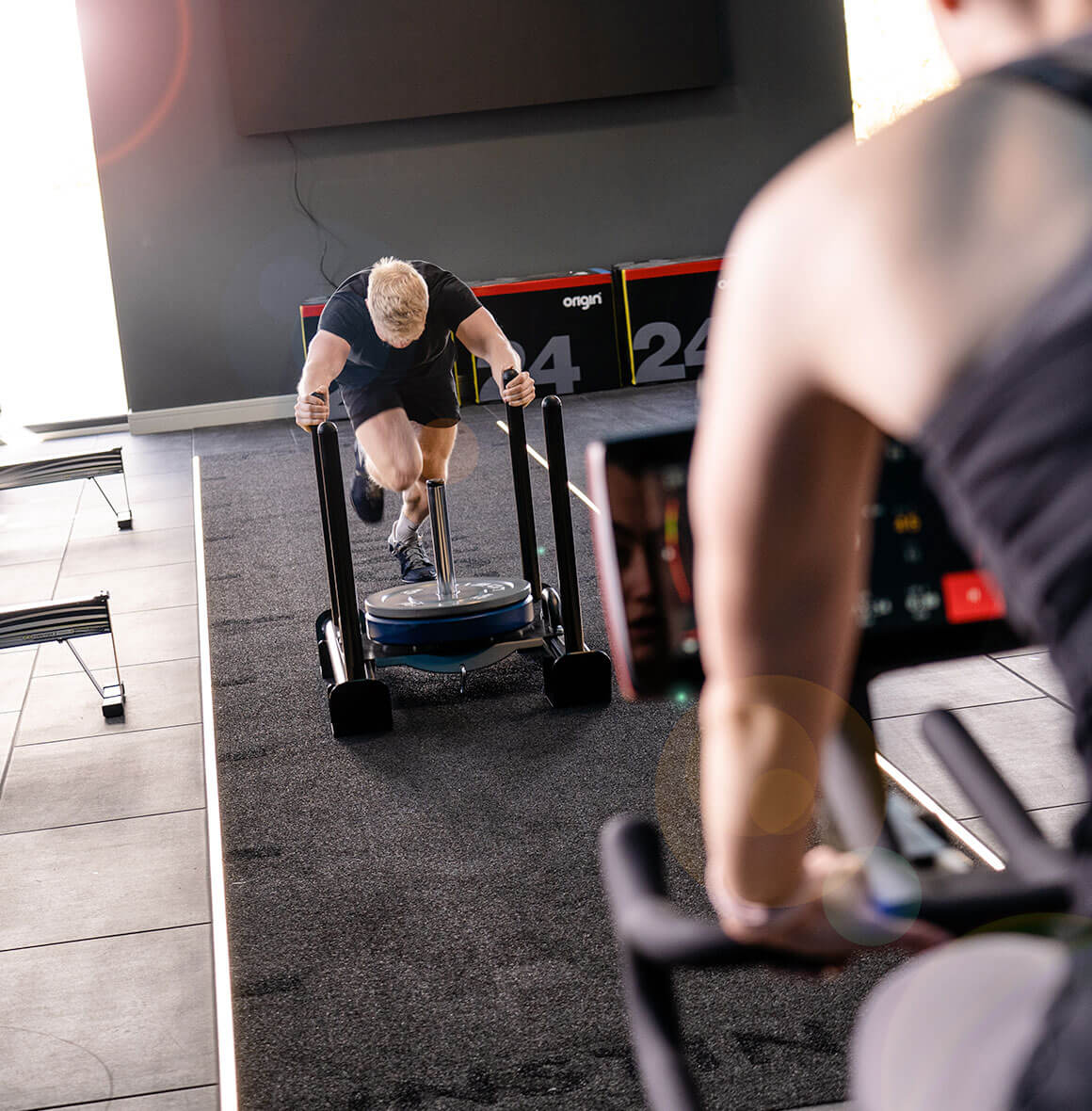 A client working hard, pushing a sled in a personal training session.